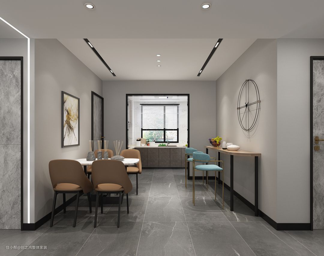 餐厅和厨房做一体化空间,用餐超级方便,靠近墙面还做了一组吧台,简单实用;餐厅选择岩板台面、金属还有玻璃制品等等为空间缔造出丰富的层次感,也彰显了业主高品质的生活格调!