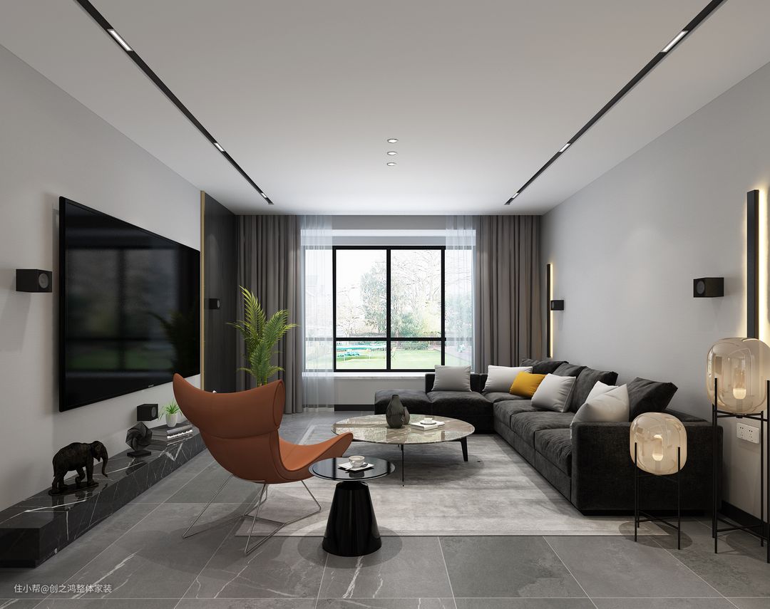 客厅设计并不复杂,墙面选择灰色的艺术漆装饰,配色同色系的家居,非常养眼;客厅选择无主灯设计,减少做了吊顶层高变矮的压抑感;电视柜选择大理石地台,不仅颜值超高,上面摆放小板件也是空间一抹亮丽的风景线,实际上这个是抽拉抽屉,将杂物可以实现更好的收纳,营造简约清爽的客厅空间;