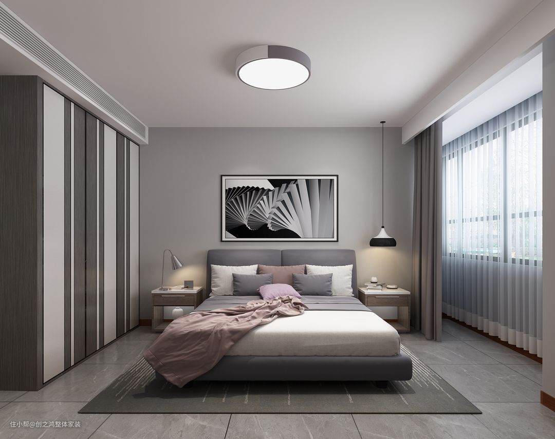 主卧以中性色调为主,背景墙虽然也是灰色,但是床品的颜色选择了莫兰迪色系,让原本单调的色彩变得更加好看!
