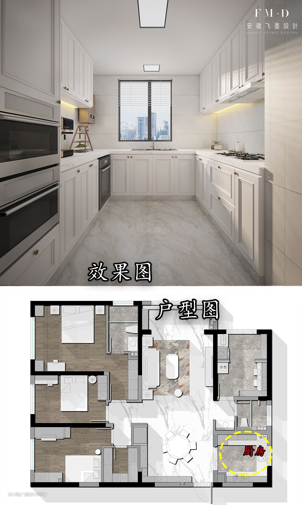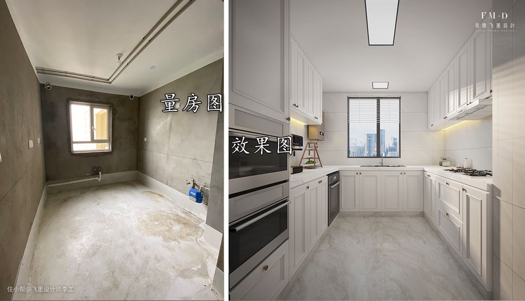 从量房图得出,这家的厨房户型方正,而相比于“一字型”、“L型”橱柜,布局方正的厨房更适合定制U型橱柜,将空间利用最大化。