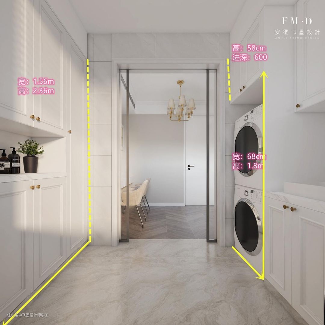 做洗衣柜将洗衣机、烘干机嵌在里面,增加收纳的同时,也让空间更显整洁干净。一旁无缝衔接了水池,可机洗可手洗,满足多功能的需求。