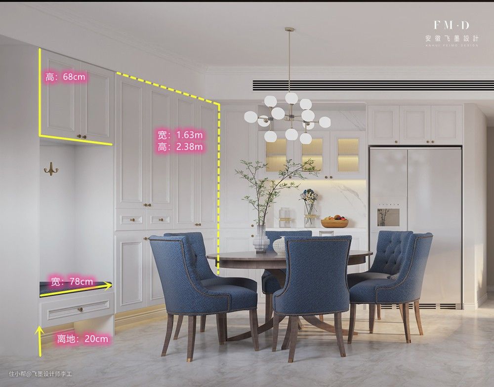 玄关的旁边就是家里的餐厅了,准备安排一张复古(橡木+杨木)大圆桌,宁静中透着天然的高贵与典雅。一旁会定制一组餐边柜,样式上选择吊柜+地柜组合的设计,其中吊柜做长虹玻璃柜门,再嵌入灯带,营造出朦胧的视觉美感。
