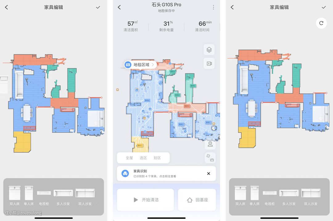 石头G10S Pro还有一些比较有意思的功能,比如自动识别地面材质、家具、对房间进行判断命名等,个性与智能化都很强,地图也变得越来越完善和好看了。