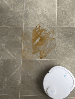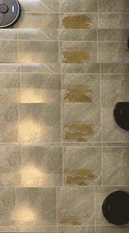 云鲸J2擦地一遍后,肉眼可见的还有酱油风干后残留的痕迹,第二遍后瓷砖地面基本洁净,略有点泛黄。