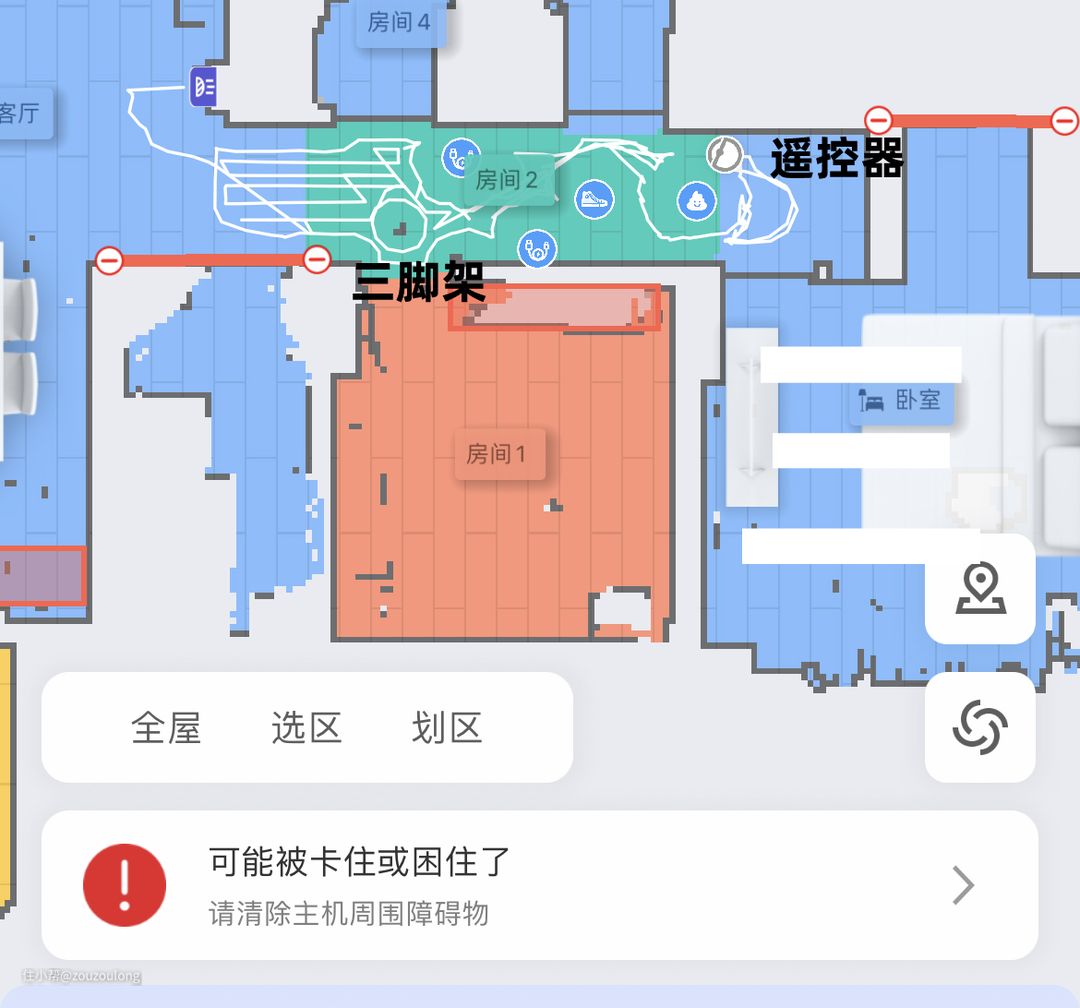 发现并判断为障碍物后,机器人会尽量地避开,但一些类似桌脚、无法识别的障碍物可能不会直接绕开,会有所触碰尝试,比如没有识别出来的遥控器和三脚架,就被直接认定为桌脚。G10S系列的避障策略,就是尽可能接近安全物体、远离危险物体,特别是判断为疑似粑粑的物体,周围就会出现范围较大的空气墙,机器人几乎不会到它周围,如果加上过道狭窄的话,可能出现无法通过/被困的情况。