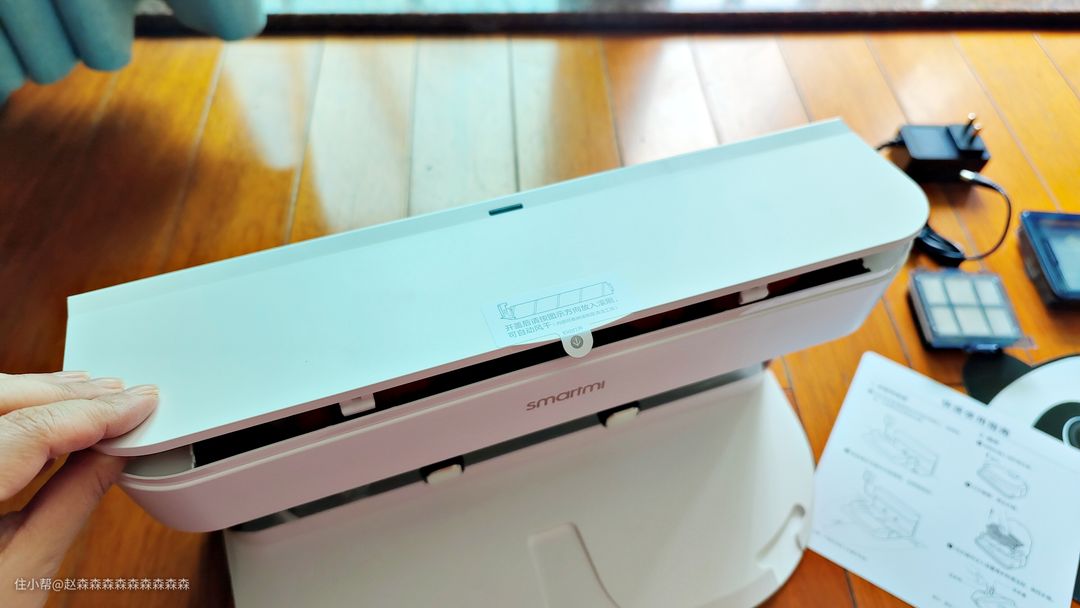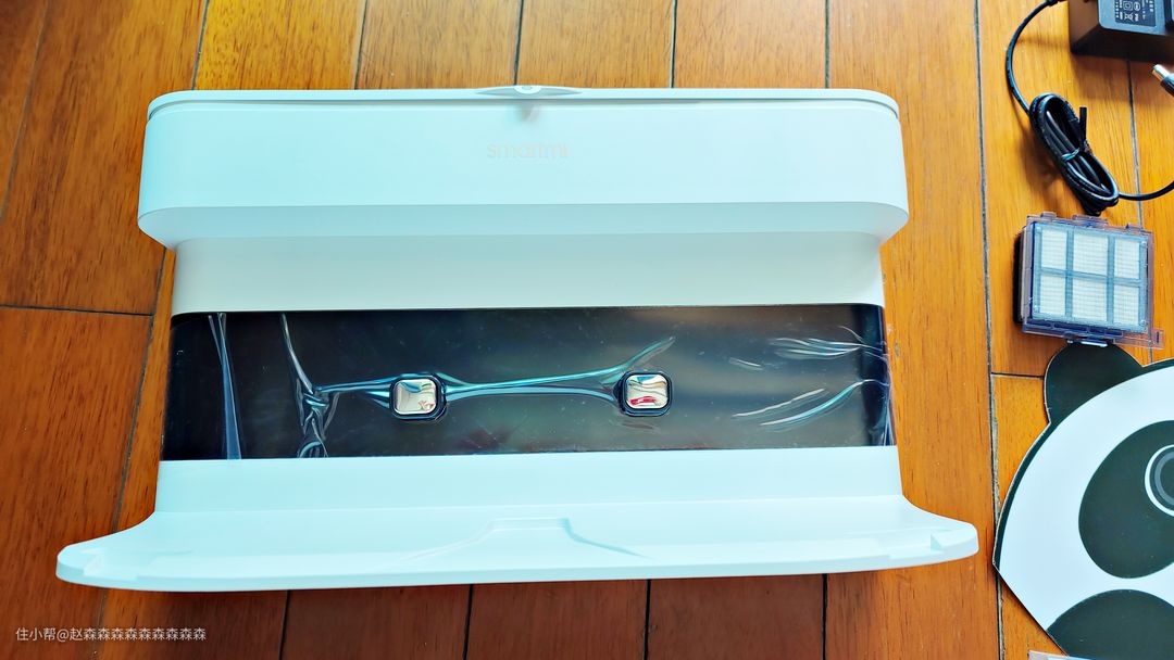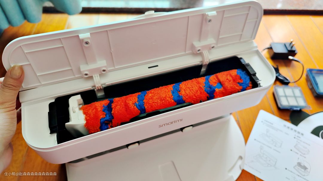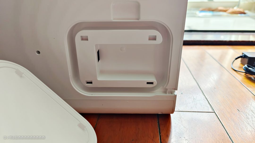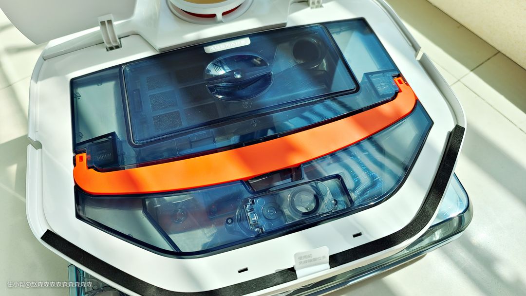 最值得一夸的就是充电座顶盖板全部打开,里面不仅是个储藏盒,还是个自动烘干盒,每一次清洁完毕,机器会自动返回充电座先进行自动清洁,然后8h 风干滚刷(单次风干时间为 12 小时)。