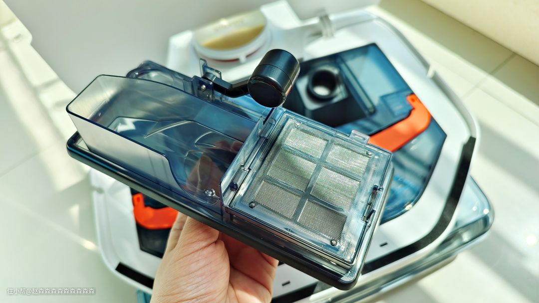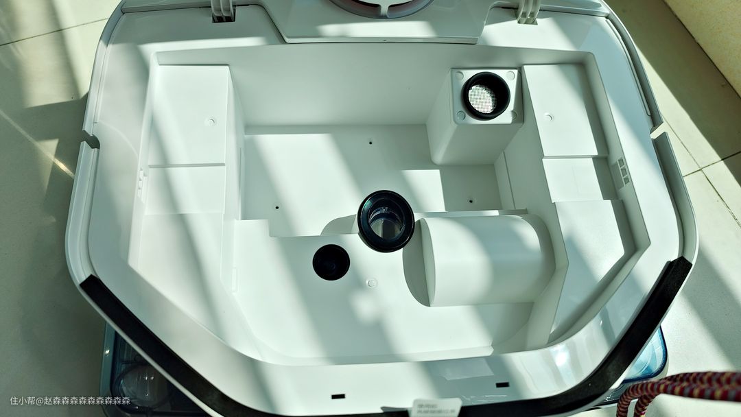 翻开面罩,就是内部一体水箱了,分别有湿用污水箱,用来回收污水,如果干扫的话可以换上干扫模式的尘盒盖。相当于同时拥有了扫地机、吸尘器、手持洗地机。