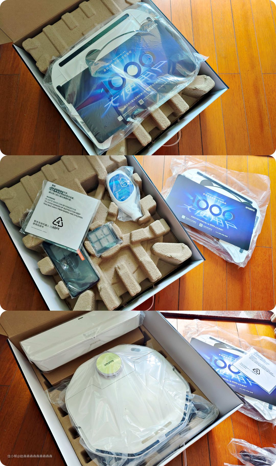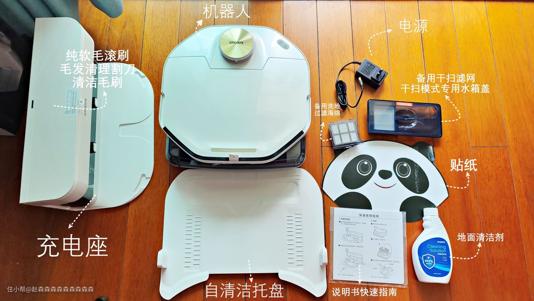 拆包装东西还真不少,充电座、机器人、自清洁托盘、电源线、备用干扫滤网、备用洗地过滤海绵、地面清洁剂、说明书快速指南、熊猫贴纸,自清洁托盘、纯软毛滚刷、毛发清理割刀、清洁毛刷(最后三个是隐藏在充电座里)。满满当当一大堆东西。非常良心了,要知道很多产品都是没有附赠的滤网这些的。
