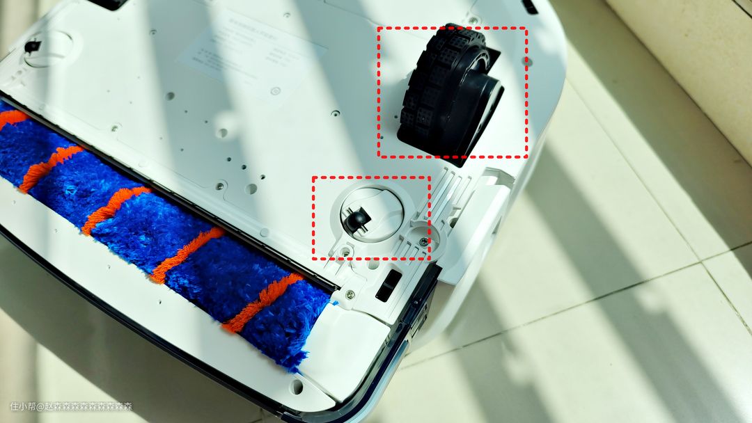 底部通过2个万向轮,2个驱动轮,还有个小导轮,灵活操控扫地机的活动。