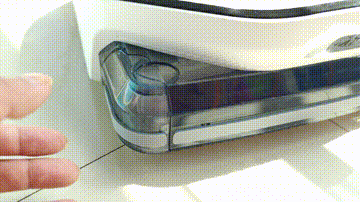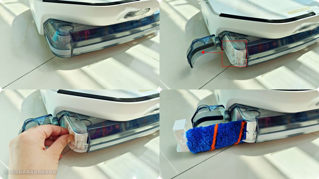滚刷得更换有点不一样,打开卡扣一拉就可以操作,机器的另外一大优点就是一体式清洁结构,通过独有的水汽分离的流道和水箱专利设计,搭配干湿两用防水风机,可以打造一个每秒活水洗地+实时污水回收+滚刷实时自动清洁,这样的好处就是保证滚刷在机器打扫地面时一直都是干净的,不会用拖布推着垃圾到处跑,最重要的是不用反复回基站洗滚刷。