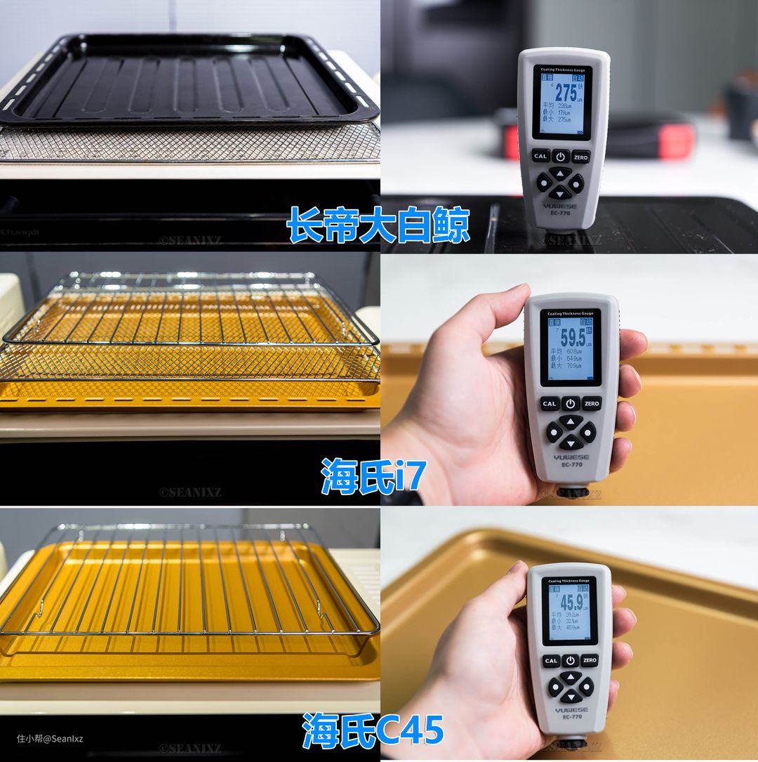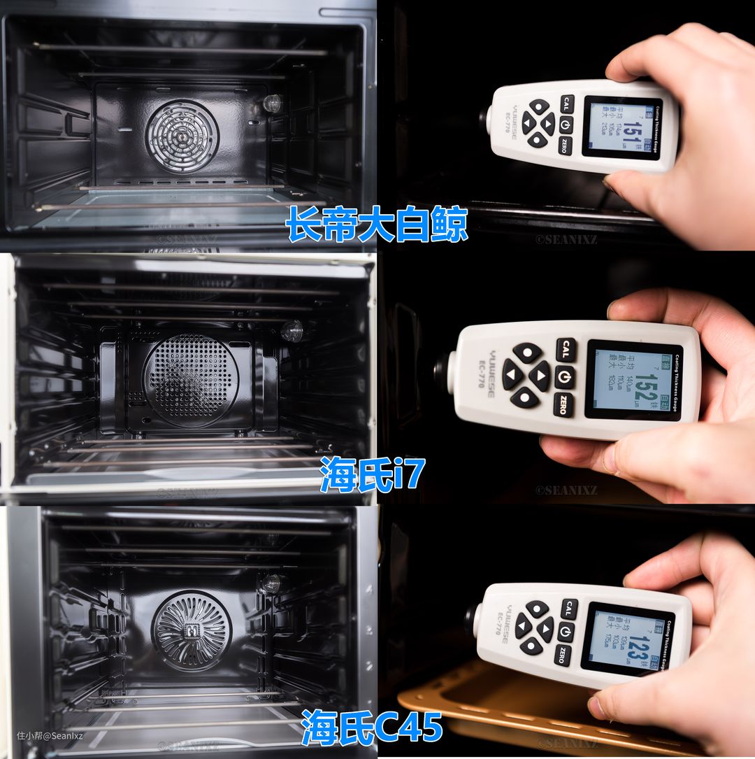 最左侧的长帝大白鲸颜色更深,海氏i7和C45颜色差不多,温度波动会影响到实际烹饪结果。