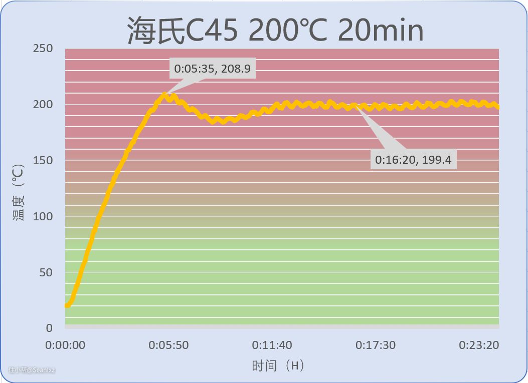 - 海氏C45有更科学的温度曲线,设置200℃预热到了210℃,为开门放食材预留了空间,继续加热温度先降低再缓慢升温,最后温度几乎是直线段的控制200℃±2℃内,非常不错的温控能力。