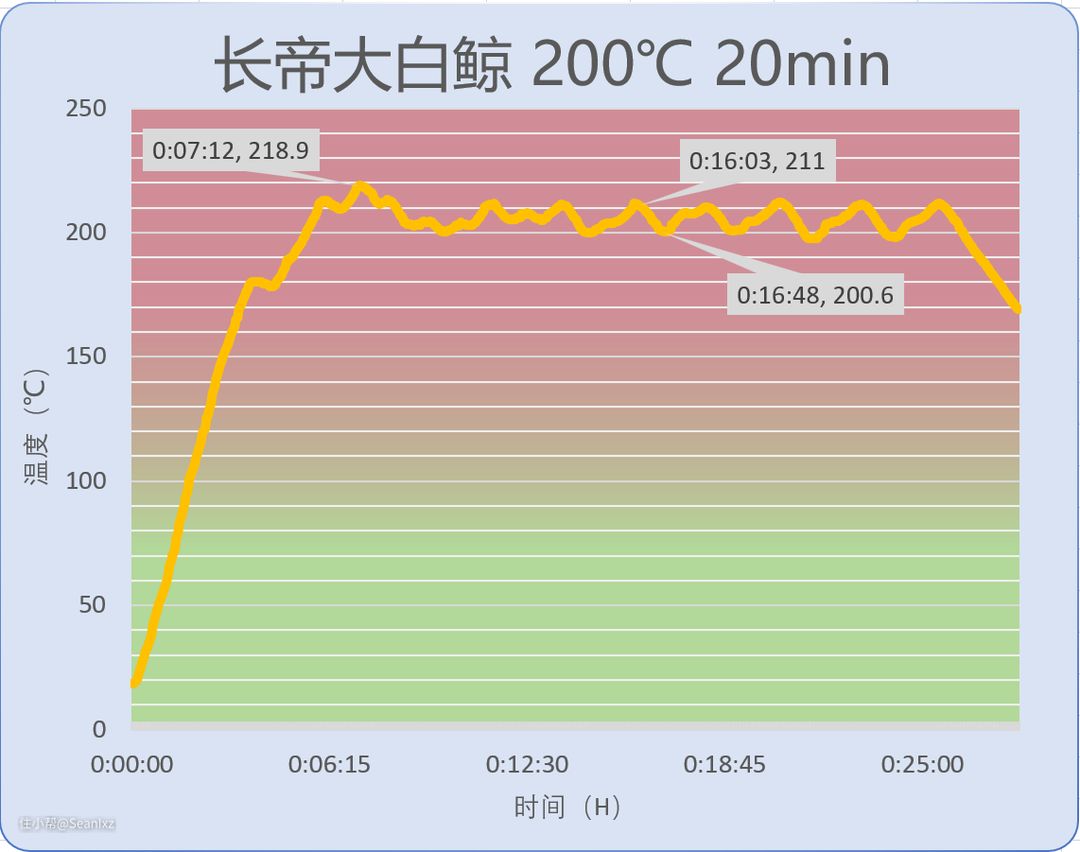 - 长帝大白鲸有更快的加热速度,前段曲线斜率更高,但可能因为温控因素,曲线有拐点,实际达到预热提示时间为7分钟,后半段加热波动较大,上下控制点温差在10℃以上,可以认为平均205℃。