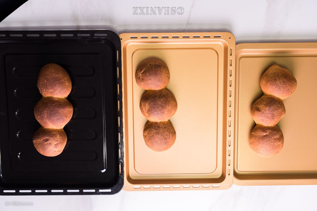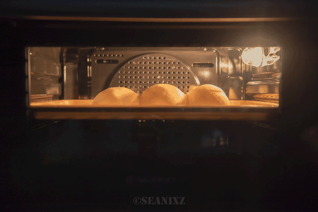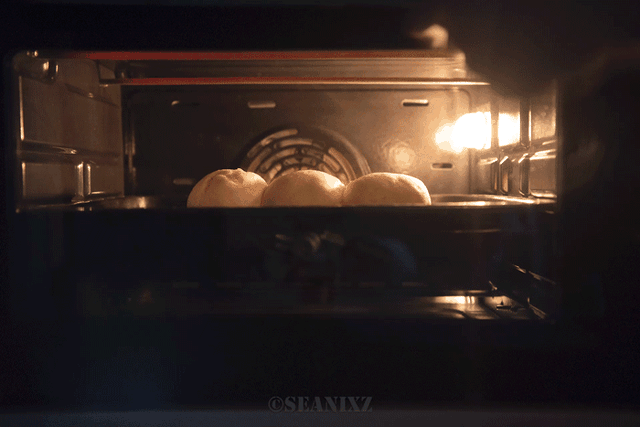 标准的面包烤制程序了,发酵好的面团放在正中间进行烤制。