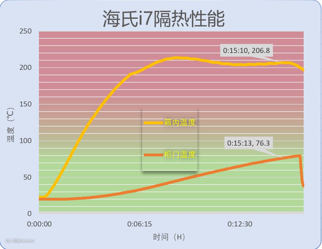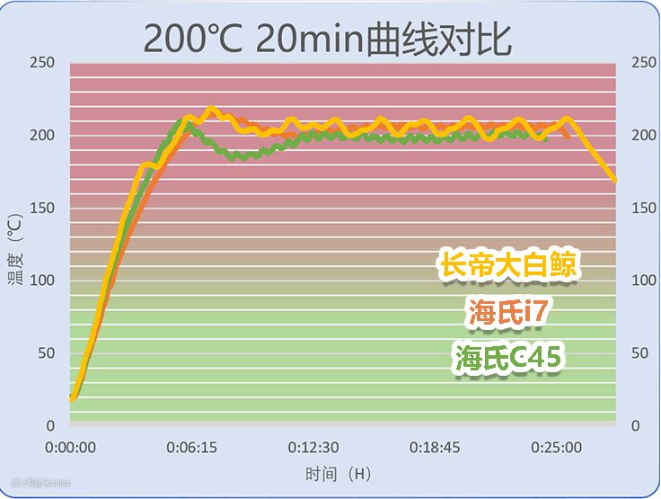 - 海氏i7的前段曲线与长帝大白鲸一致,在平稳阶段维持在了206℃的位置,稍微偏高了,但曲线十分平稳,应该是校调问题。