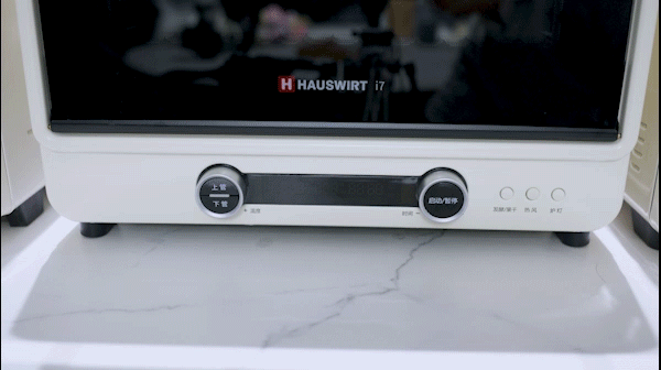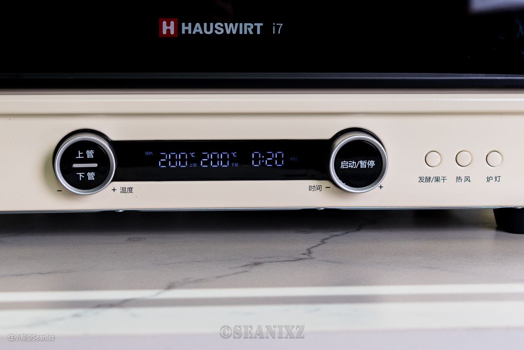 海氏i7采用的是双旋钮加按键操作,温控和上下管控制操作便捷,温控精度根据功能28~80℃为1℃一个档位,80℃~230℃区间为5℃一个档,i7的控制功能相较而言比较简单,只有上下分区控制以及果干/发酵/热风开关,预置功能较少,需要有一定的使用烤箱使用基础。