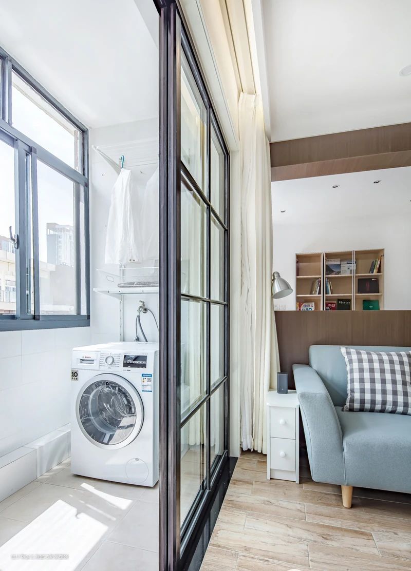 定制化的阳台洗衣柜能根据户型需求做到严丝合缝,只需前期先测量好洗衣机的尺寸,预留好位置,定制正好合适的阳台柜,这样可以充分利用阳台的每一寸空间,而成品柜体尺寸有限且固定,不能将空间最大化。