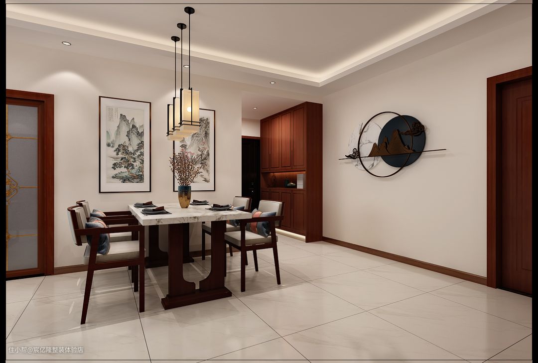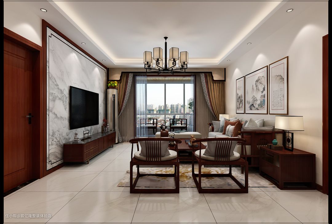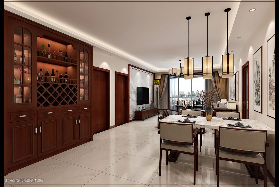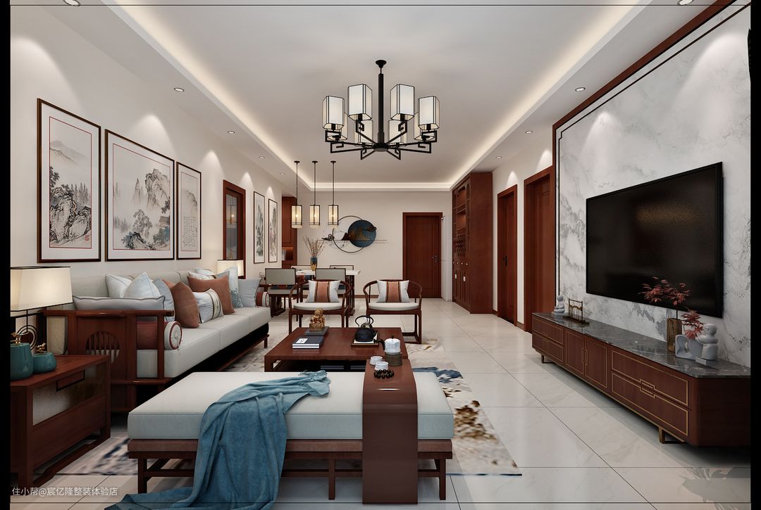 95平新中式,红木家具文贵高雅宸亿隆整装体验店2022-03-30阳台放置两把椅子,闲暇时坐在窗边赏景品茗餐客厅一体,通透敞亮,连成一体的灯带, 酒柜和储物柜,增加空间的容纳能力水墨画和现代感造型的饰品,让房间更有诗情画意