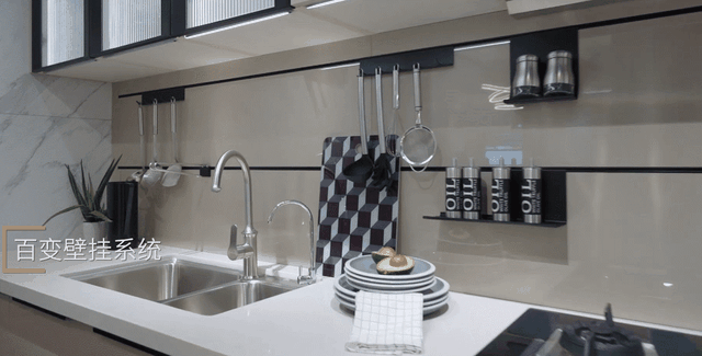 4、墙面中部做可移动挂件,挂上下厨常用的调味品、锅铲、汤勺等物品,让下厨过程更便捷。