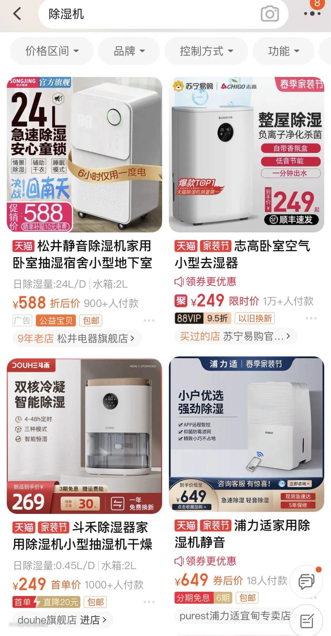 至于卧室空间,如果觉得空调除湿一般,可以考虑购买一台除湿机,某宝家用除湿机价格在百来块钱的左右。