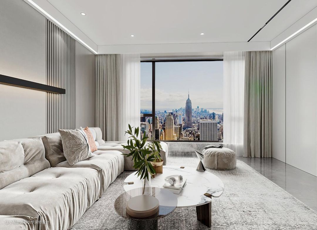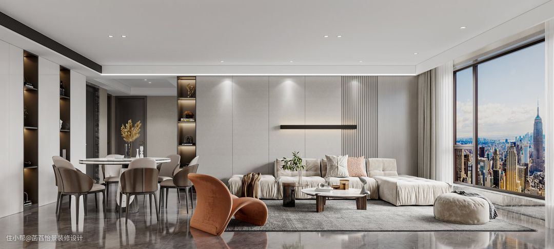 柔软的沙发搭配着一组高低不一的圆形茶几,窗外的阳光利用窗帘进行调节,营造出一个舒适的生活氛围。