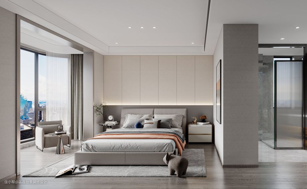 主卧的空间大气且明亮,一面大大的落地窗为室内带来了充足的采光。灰色调的床品软装搭配着床头的灯带,营造出一个舒适的空间氛围。