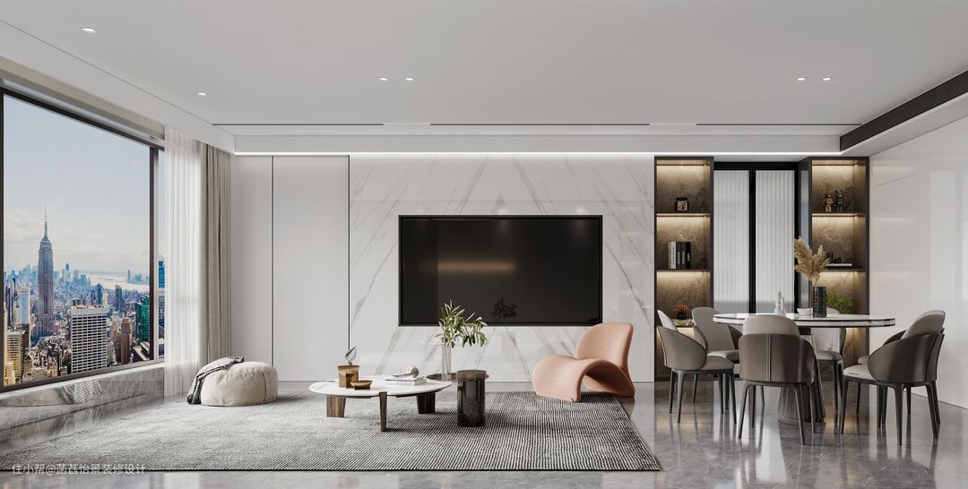 电视背景墙利用石材进行装饰,将电视机嵌入其中,一侧做了一个隐形门的设计,通向次卧的空间。客厅与餐厅都是在同一空间内,顶部的射灯为这个区域带来了明亮的空间感。