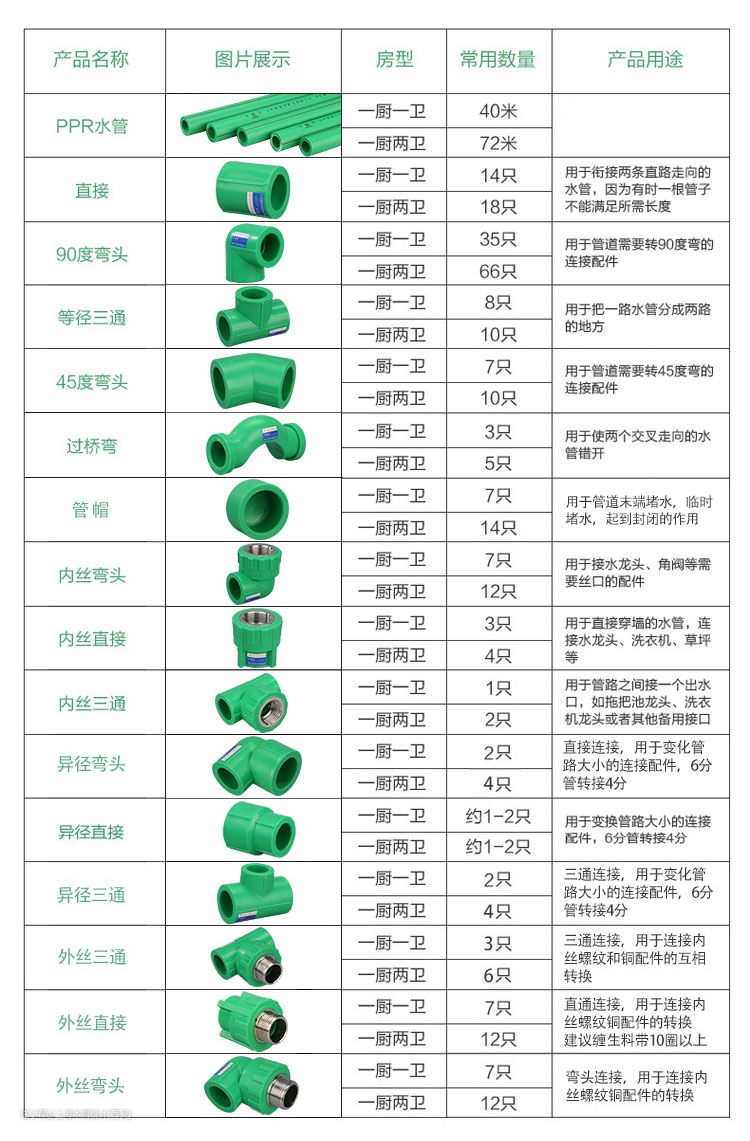 PPR水管需要这些配件来连接,改变水路方向,增加出水口等。但是一般90%以上的漏水都发生在这些配件与水管的连接处,因此,水管配件的连接手法很重要。