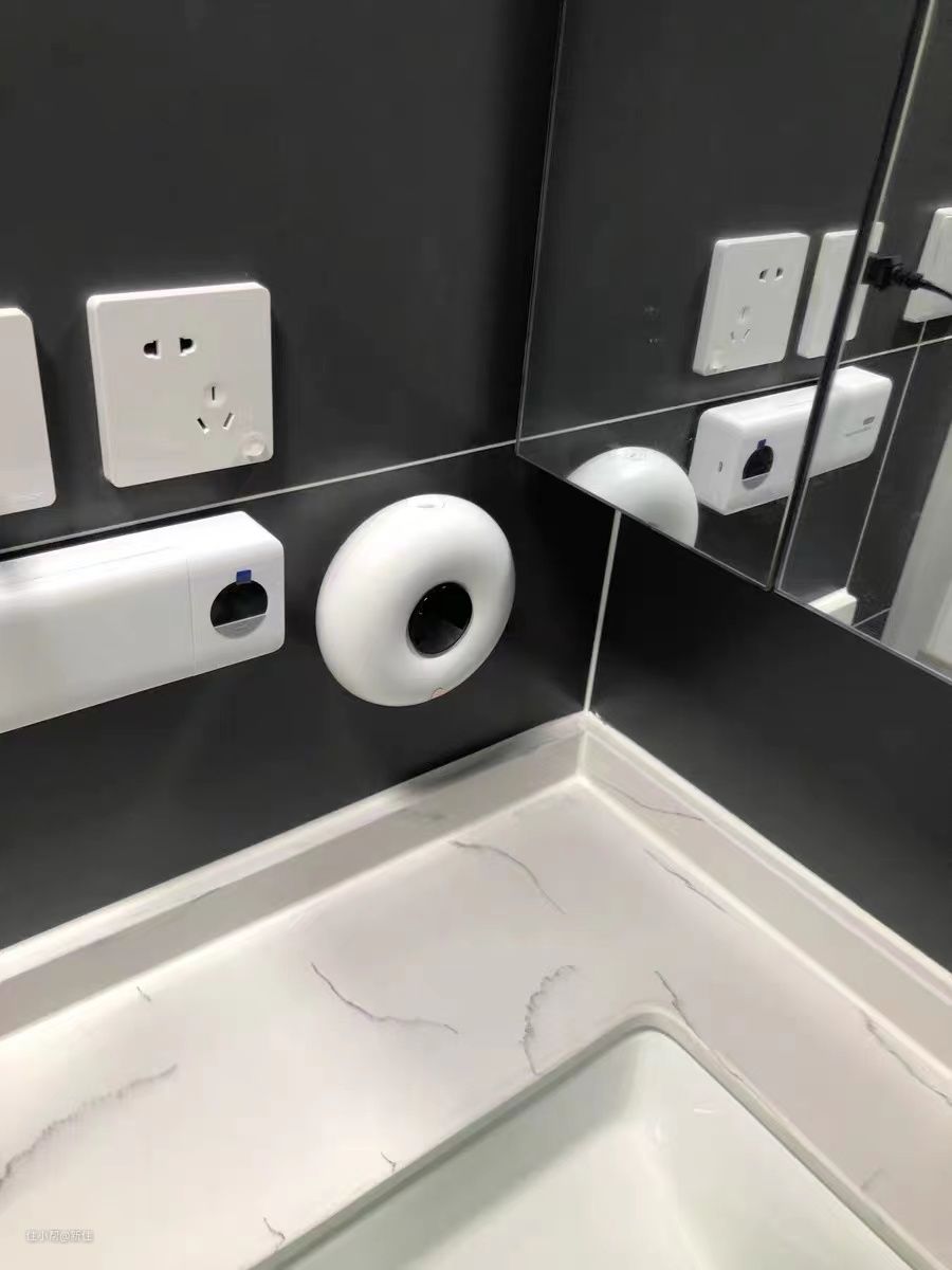 外形像一个胖乎乎的甜甜圈,挂在墙上很可爱,手放到跟前,就能自动感应出细密绵软的泡沫。