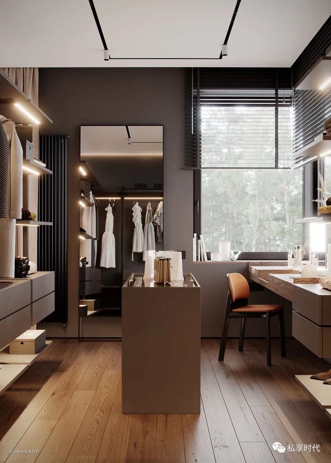 衣帽间是品质生活的一个重要指标,也包含着生活的千姿百态。设计师巧妙运用原木、金属等材料来拓宽视觉感及表现光影的和谐,创造出直撩心底的优雅魔力,让时尚成为衣帽间的一大亮点。