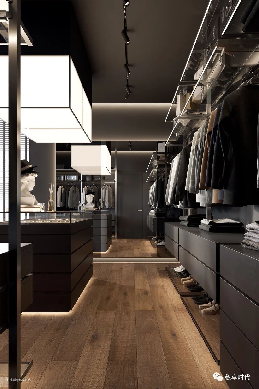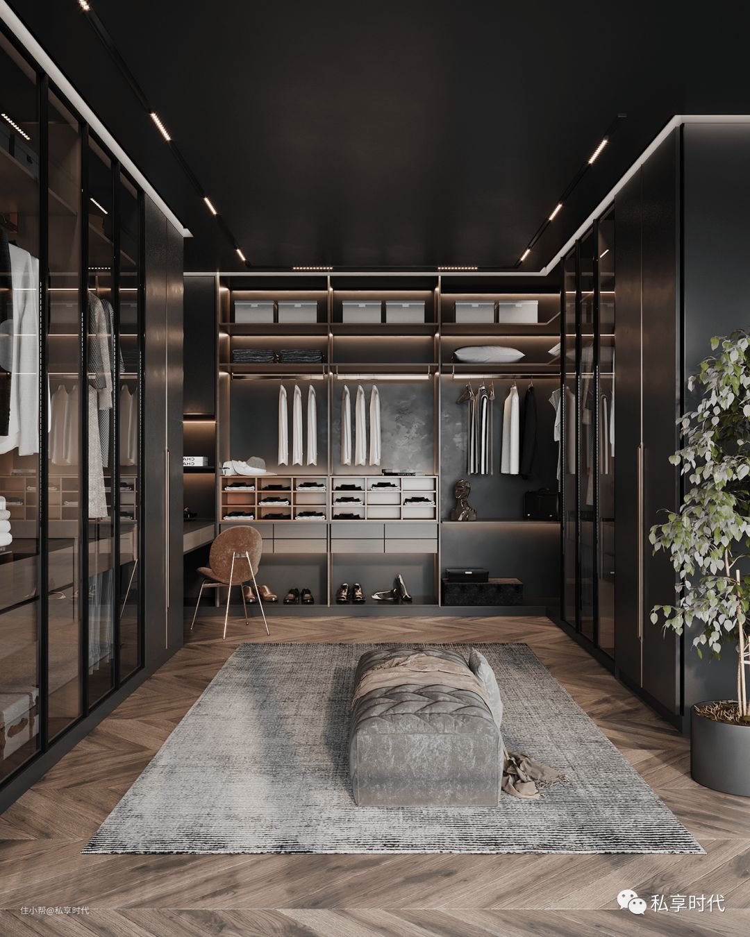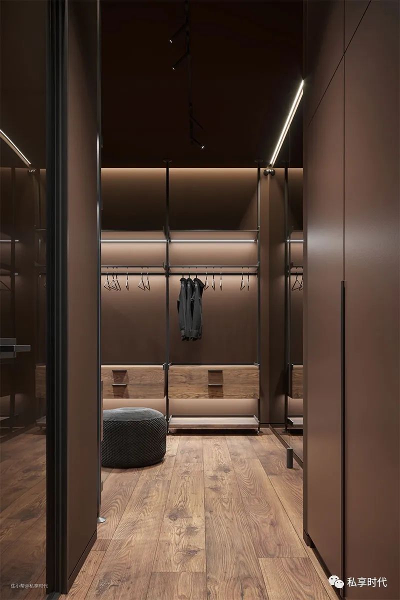 步入式衣帽间,以深色门板+木质纹理布局主题,浓郁的暗黑龙质感饱满而沉稳,搭配低调的灰色地毯,让时尚与复古形成激烈的碰撞,收纳力最大的同时也腔调十足。