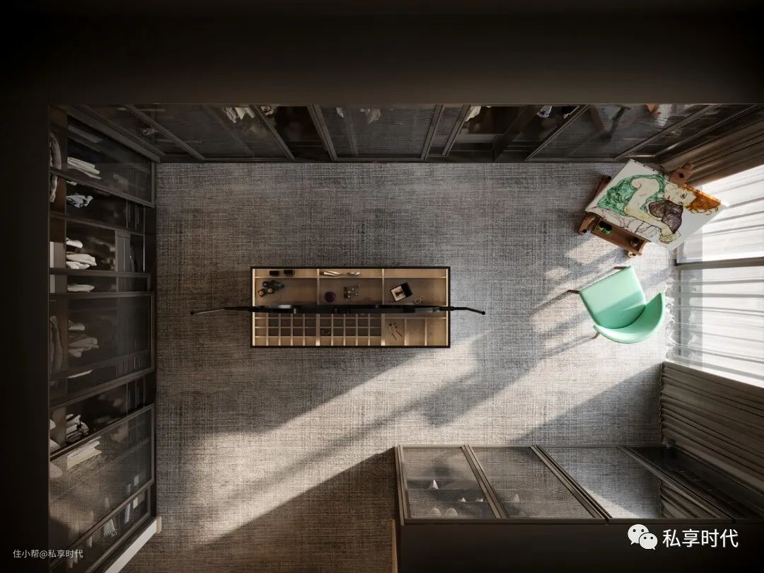衣帽间以深色的硬朗贯穿空间,理性的柜体内部结构与多元材质的相互碰撞(铝框、木饰面、玻璃 )将开放式格局下的这种张扬热烈演变为一种来源于骨血的自信,每一个细节都在一定程度上做到了陈设展览的作用,也给与柜体空间更大的灵活性和包容性。