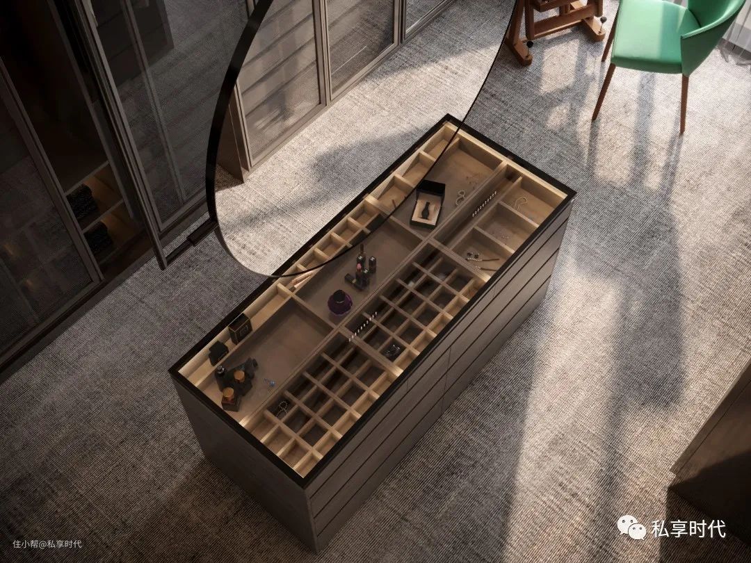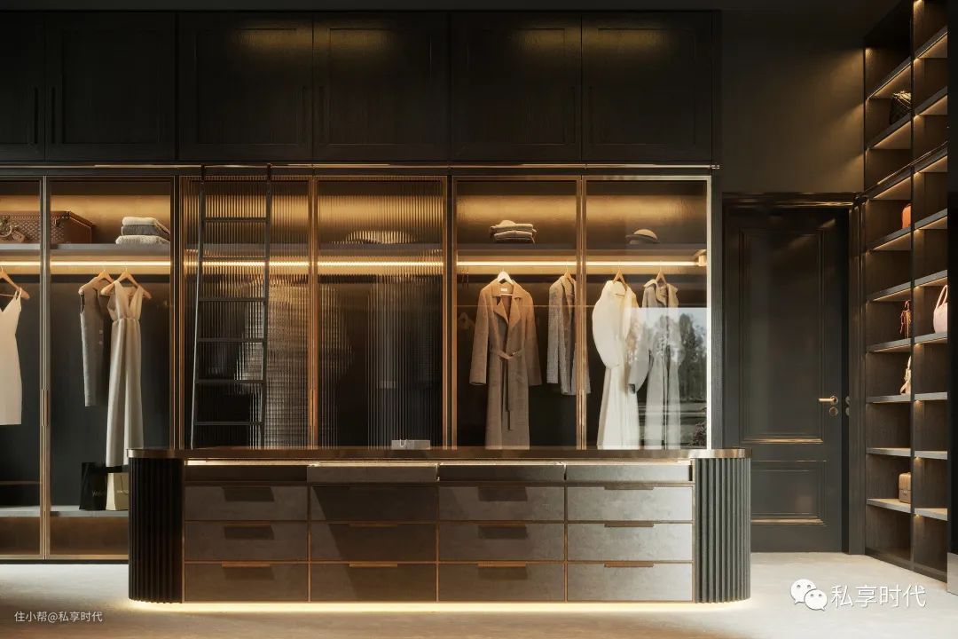 运用多重材料和个性理念相结合,用线条和比例营造层次丰富、语言多彩的空间。开放式的衣帽间在灯光的折射下,将精英贵族的高级感演绎得淋漓尽致。