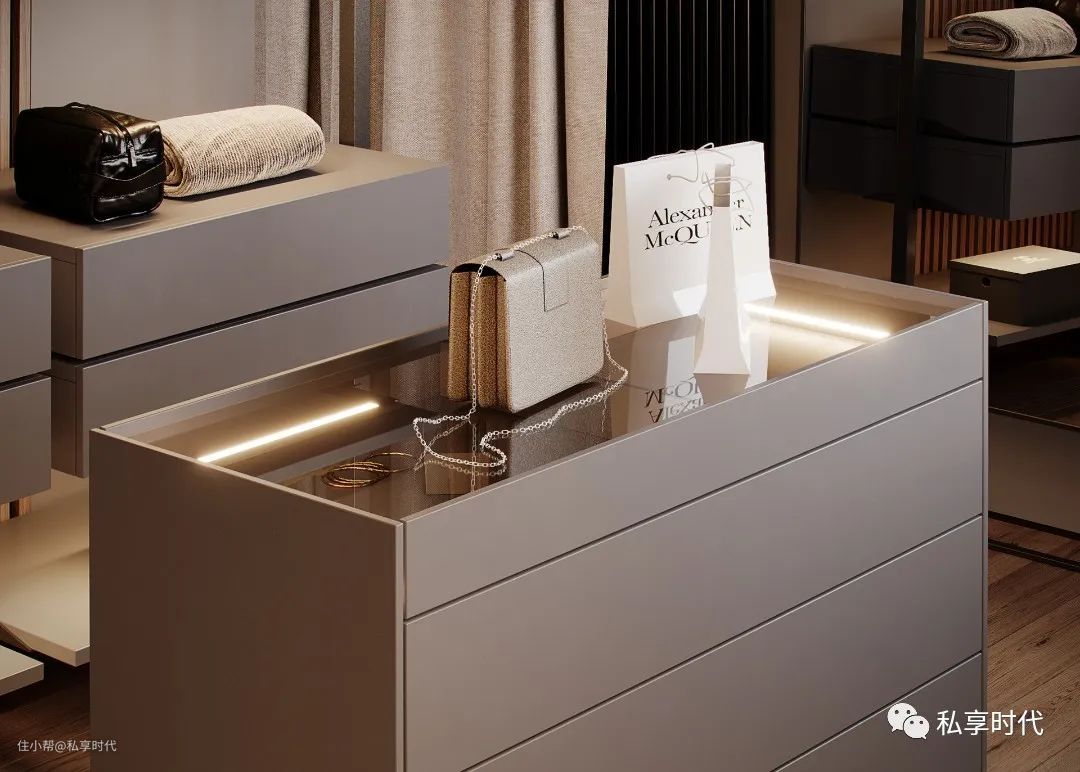 有型、有质、有奢的衣帽间一眼就能被时刻记住;材质的触感让人心情愉悦,每个功能区一应俱全,方便日常衣物的拿取;在灯光的折射下视觉上通透又显璀璨奢华。