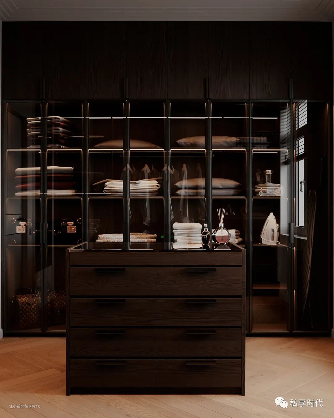 铝框玻璃门是空间的最大亮点,让衣帽间在保持通透明亮的氛围下视野更显宽阔,深色柜体与原木地板的过渡,二者完美配合,营造生动而具欣赏性的妙趣观感。