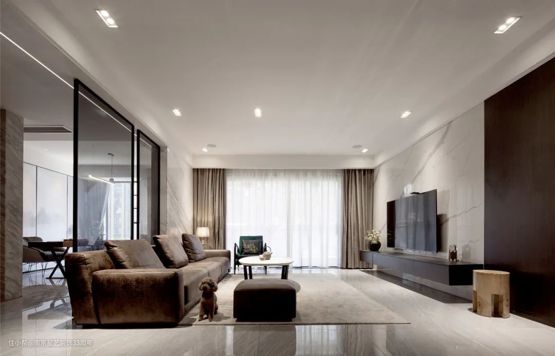 天花整体吊平加入暗藏筒灯的设计,然后在沙发墙或电视墙处留灯槽来装暗藏灯带,这样直接照明与漫反射照明相组合,可以实现更加灵活舒适的照明效果。