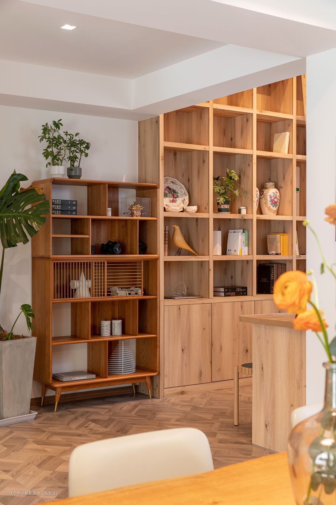 女主人很喜欢实木做的家具,自然淳朴,仿佛会随着时光而呼吸生长,越来越有味道。直通三楼天窗,需要爬梯的整面墙的书架,未搬进来的100多本书籍终于可以从储藏室里重见天日,没有什么排列方式,率性而为,疏松有序,与各处淘来的工艺品竟也相映成趣。