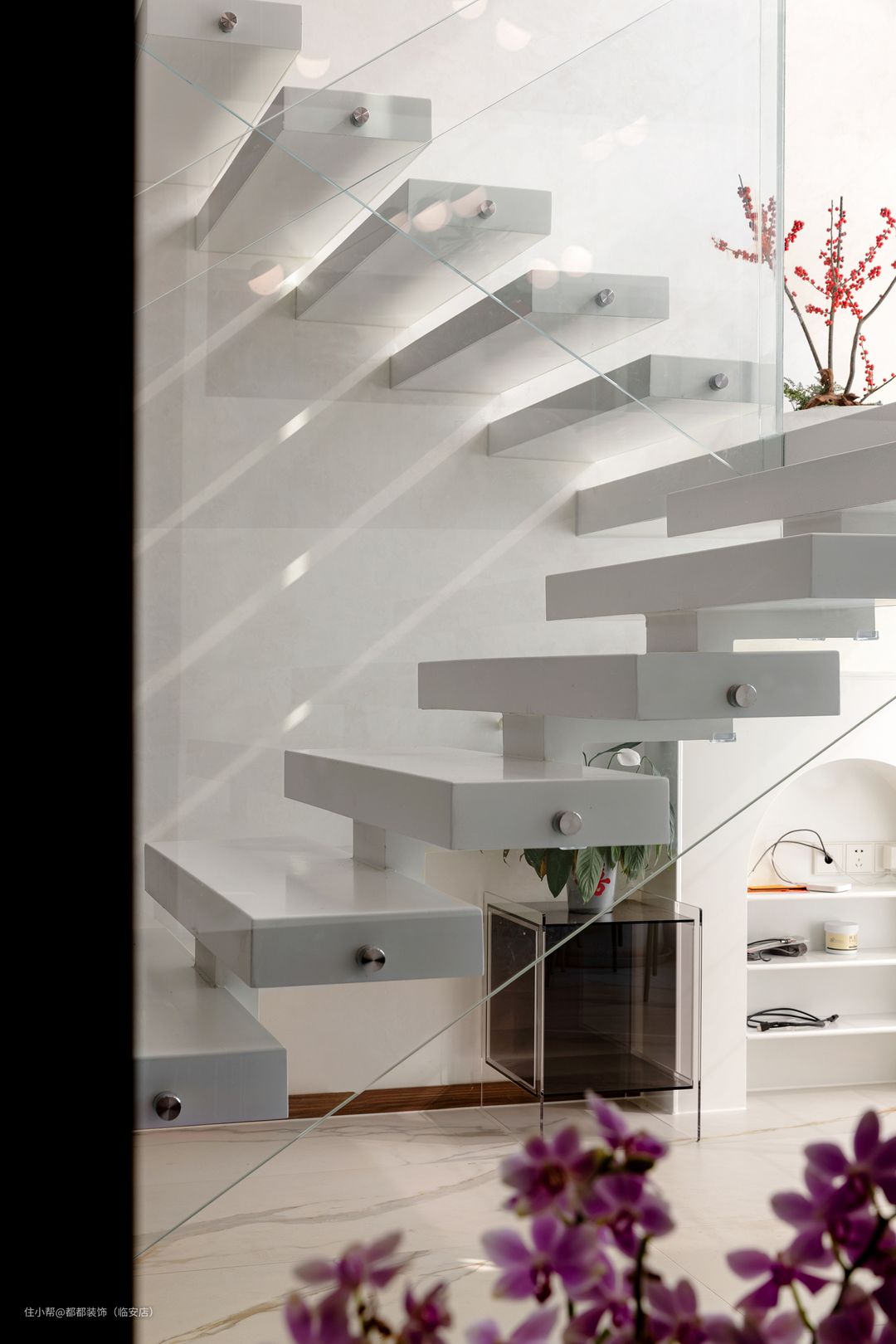 拾阶而上,石材制成的台阶,敦实且沉静,踏上第一步时或许会有些害怕,但那种奇异的畅快瞬间就会掠夺你的心房,流转的光线透过玻璃投射下摇曳的影子,赋予脚下风景独特的美感,每一步逐光而去,心情又怎么会不好。