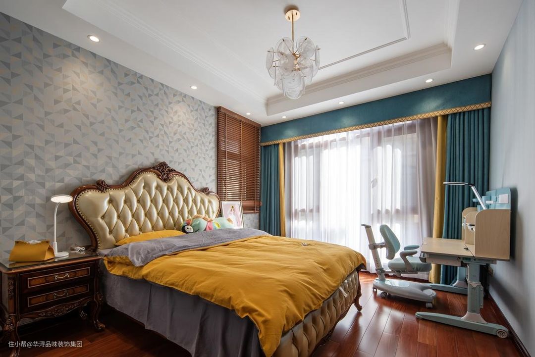 女孩房中选用了欧式床,这组床的床头厚实、填充柔软,能保证女孩在睡觉时头部不会被磕伤。