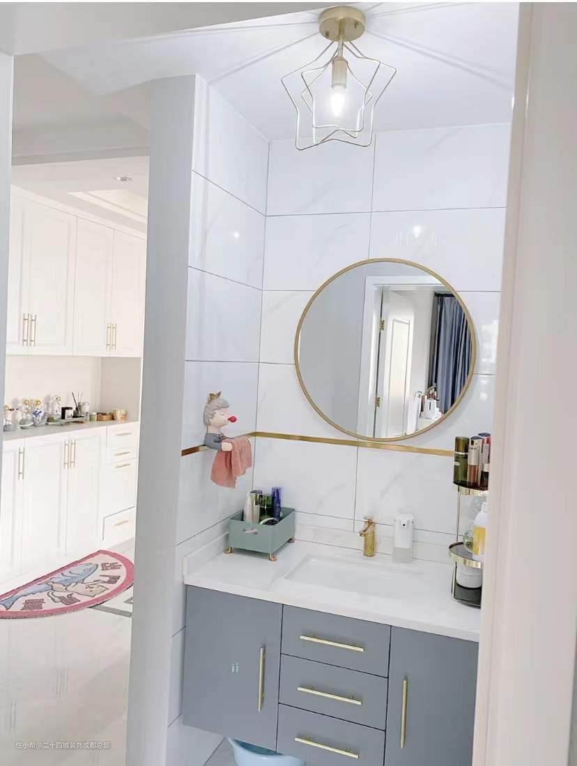 疫情期间,回家洗手是件非常重要的事情,一个独立的洗漱台也就很有必要了。卫生间做干湿分离的设计,洗漱台作为干区在门外,不仅实用性很强,装饰效果也很好。