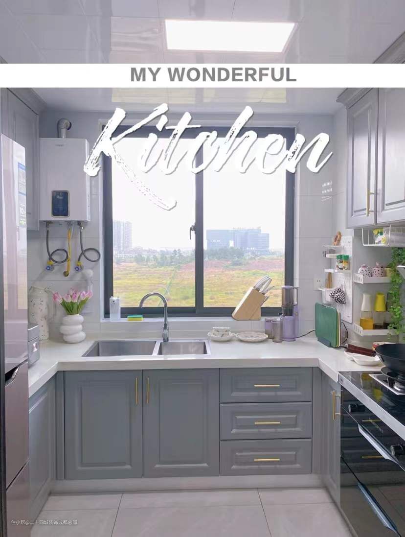 厨房内做U字型设计,橱柜是蓝灰色,耐脏又好打理,搭配金色的金属拉手,非常的高级。厨房大大的窗户可以看到外面的风景,窗外还没有高楼修起来,视觉效果很不错。