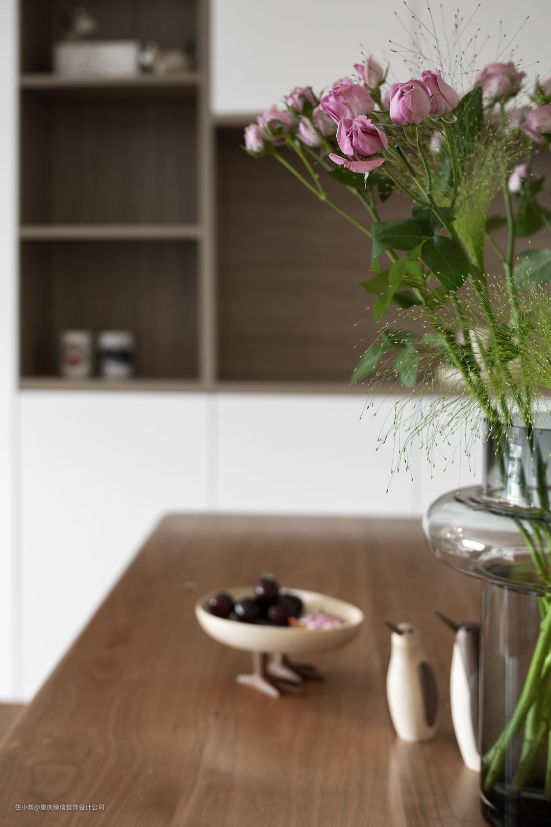餐厅区域一副寻常人家的生活模样,质朴但不平淡,没什么花里胡哨,也未曾想和“高级”刻意沾边,木料、绒面、皮质、白纱、书籍,都带着一种随意感,随意才可清简,清简之余韵才可亲近。在功能上做了定制餐边柜及卡座的形式,可以容纳餐厅所有的杂物,使整体空间看起来更加的干净利落。