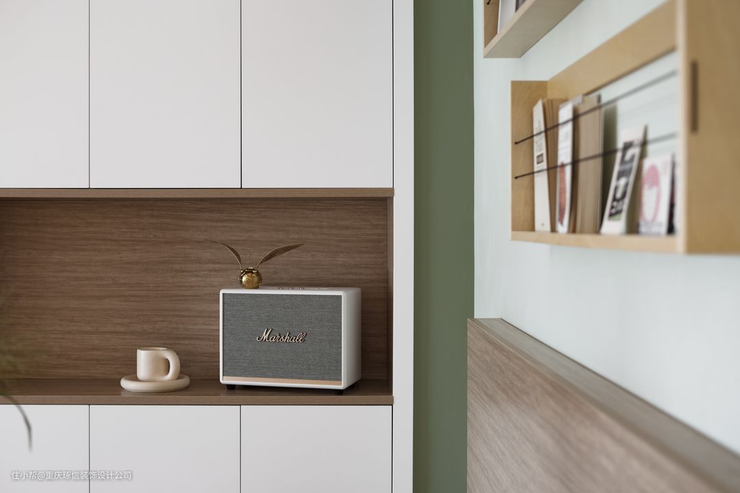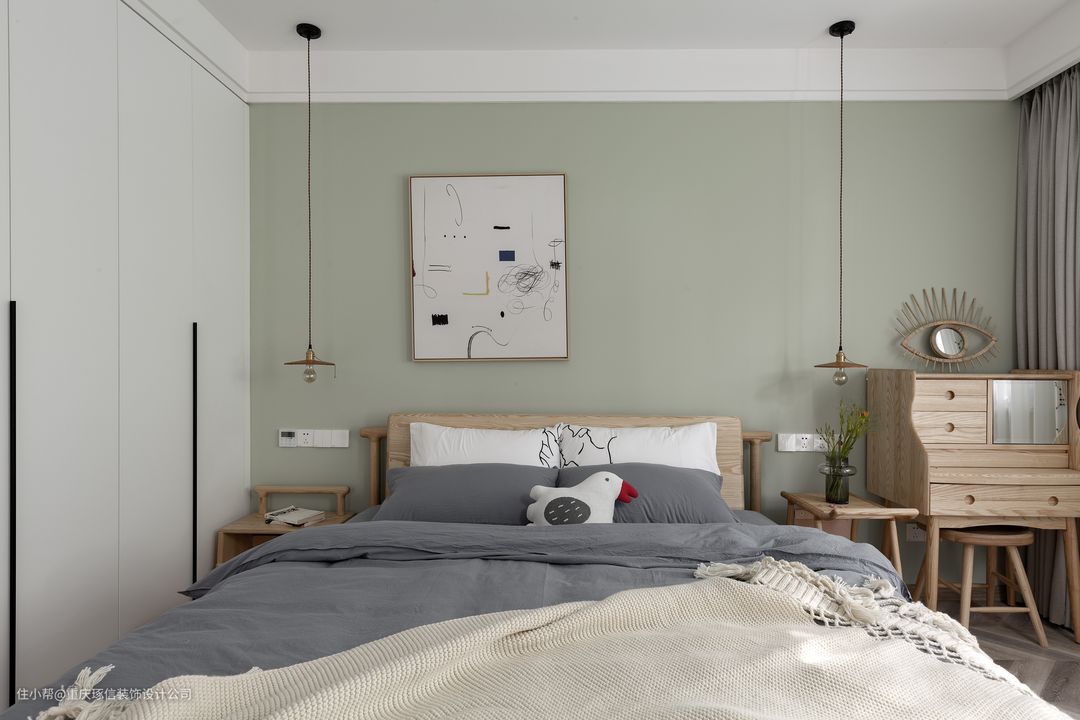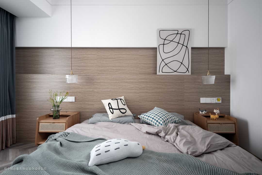 主卧属于屋主小两口的秘密天地,采用了白橡木的宁静感,窗帘也没有只用了纯色打发,而是利用不同色系与材质对比组合形成精致丰盈的装饰效果,硬装部分的空冷在软装上得以挽回,风吹帘动,琉光行云,卧室释放着乐且晏如的温柔情绪。让他们在这个空间慢慢的享受属于他们的二人时光。