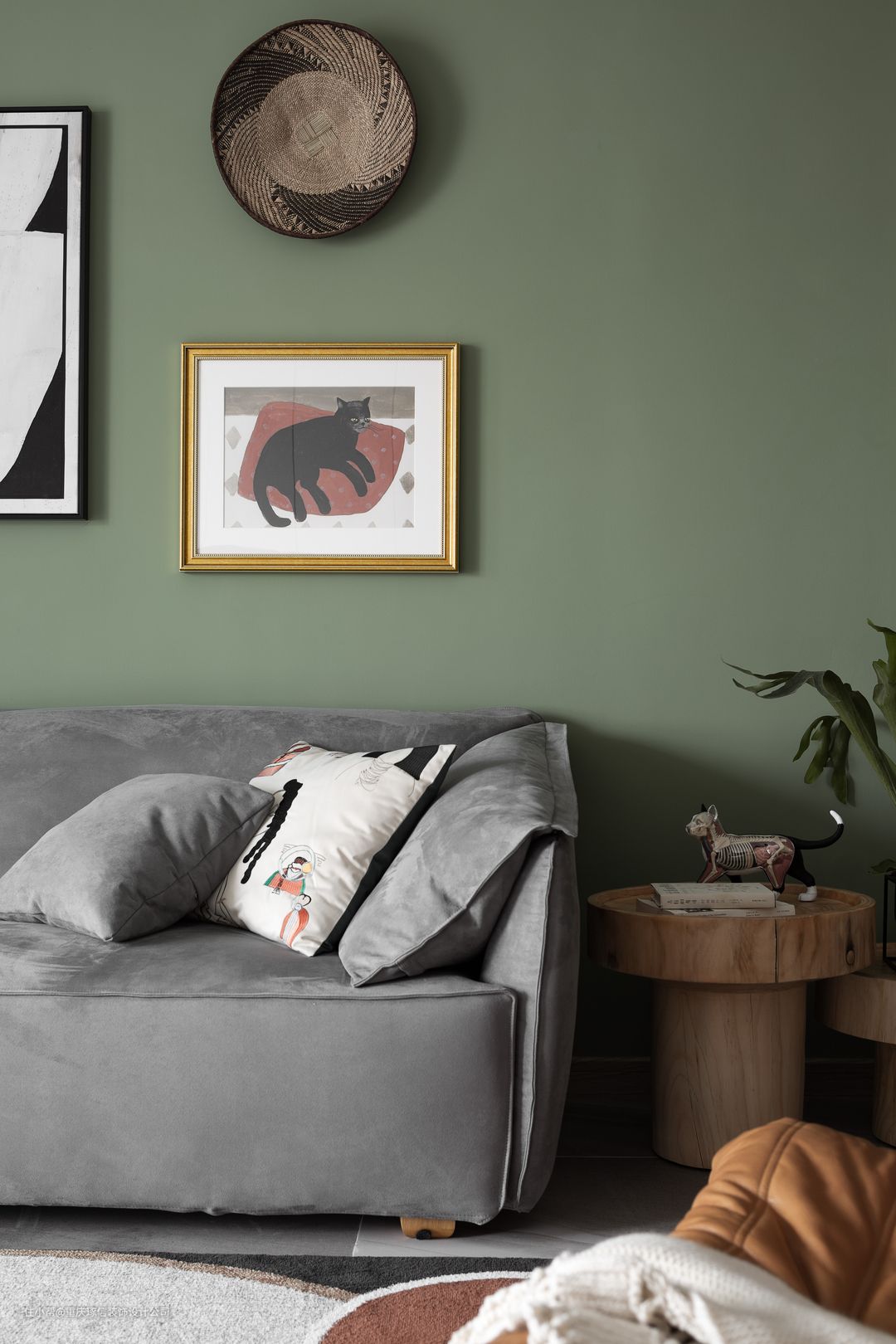 客厅大面积特意添加了屋主特别喜欢的烟灰绿,屋里处处都会有一道关于喵喵的风景线,都是他们俩的心头宝,沙发的视角最终还是选择了与入户门侧对,在整个空间,也就是餐厅,客厅,入户形成三角比例。