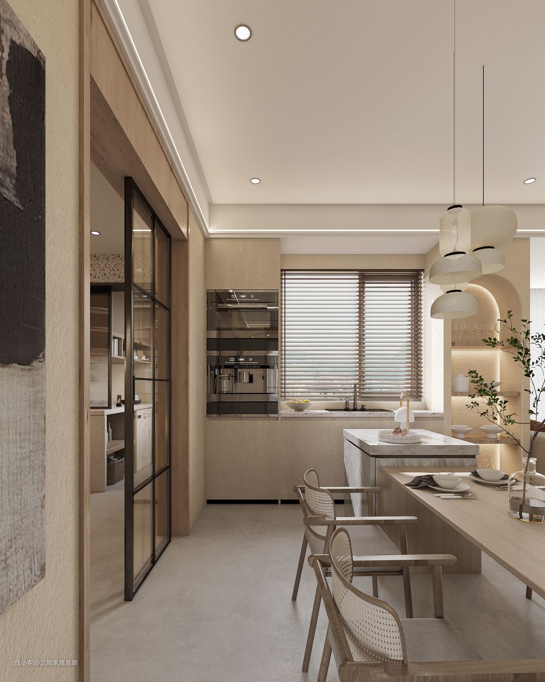 ❸壁龛+餐边柜拱形壁龛为餐厅提供了开放式收纳的空间餐边柜+洗手池既让餐厅杂物有了归宿又方便了日常备菜和餐前饭后洗手.