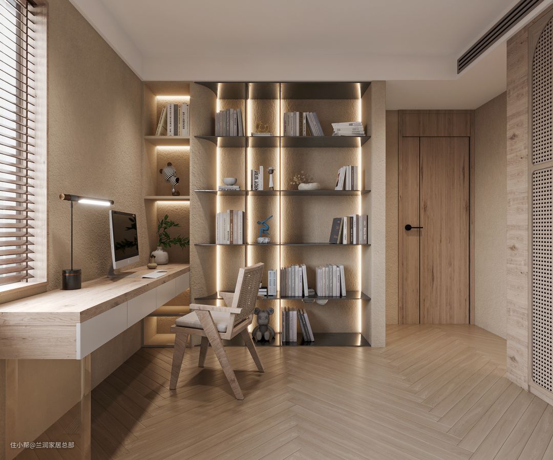 ❷收纳区嵌入式满墙柜柜门卫藤编和长虹玻璃设计原木边框契合空间裸色调,侘寂感满满大容量柜体也为四季衣物提供了收纳之处.