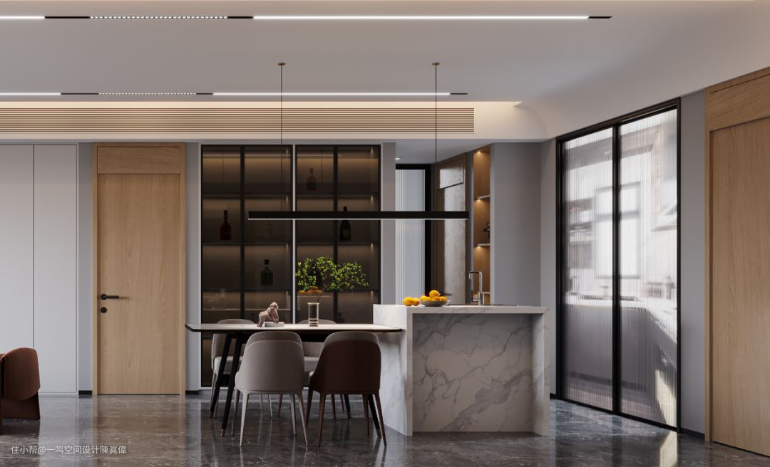 大平层没有使用暗色系使得空间变小的困扰,超大的平面给了现代风格发挥的空间,金属,岩板和长虹玻璃在这个空间内达到了微妙的平衡,彼此不同又互相成就,烘托了高级的现代感。
