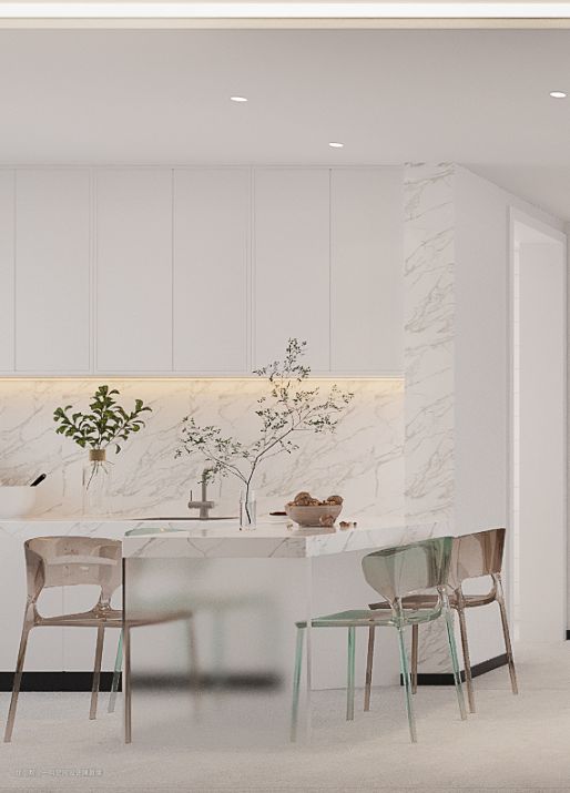 Mini厨房借助餐边台来构建,小型的厨房特别适合做一些简便的餐食,或者有朋友来的时候进行一个互动的体验。磨砂玻璃配合白色岩板的岛台餐桌,吧台质感的设计让整个空间显得简约时尚。