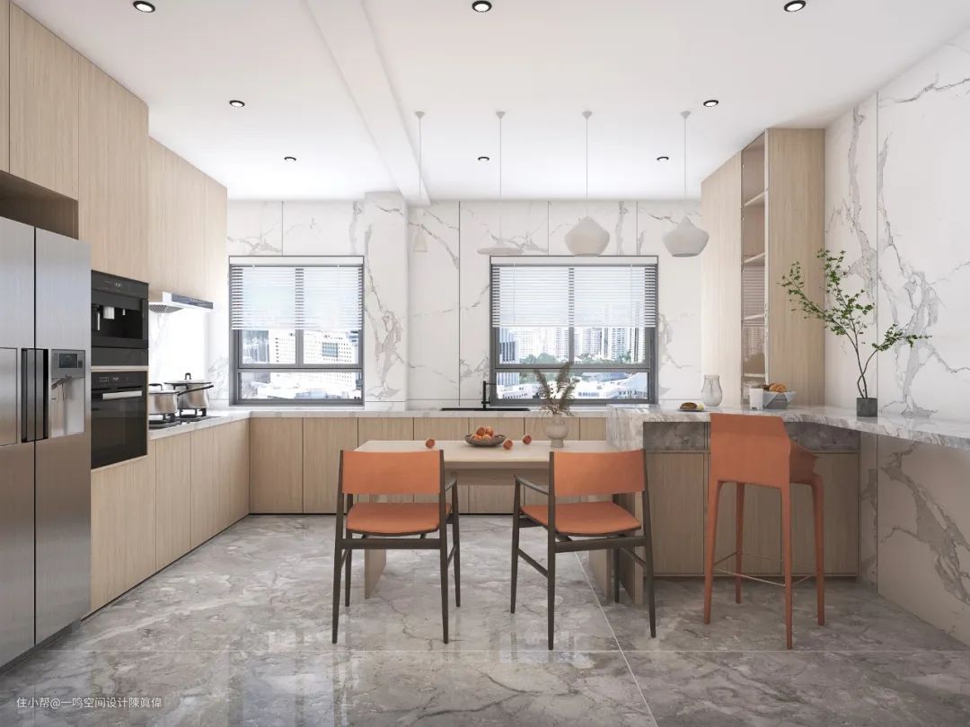 石材的材质兼容了自然与前卫的设计感,大面积的花纹让它不仅可以作为装饰用品来装饰墙面,坚硬的质感也可以用于餐桌岛台上更好打理,功能实用性更强。
