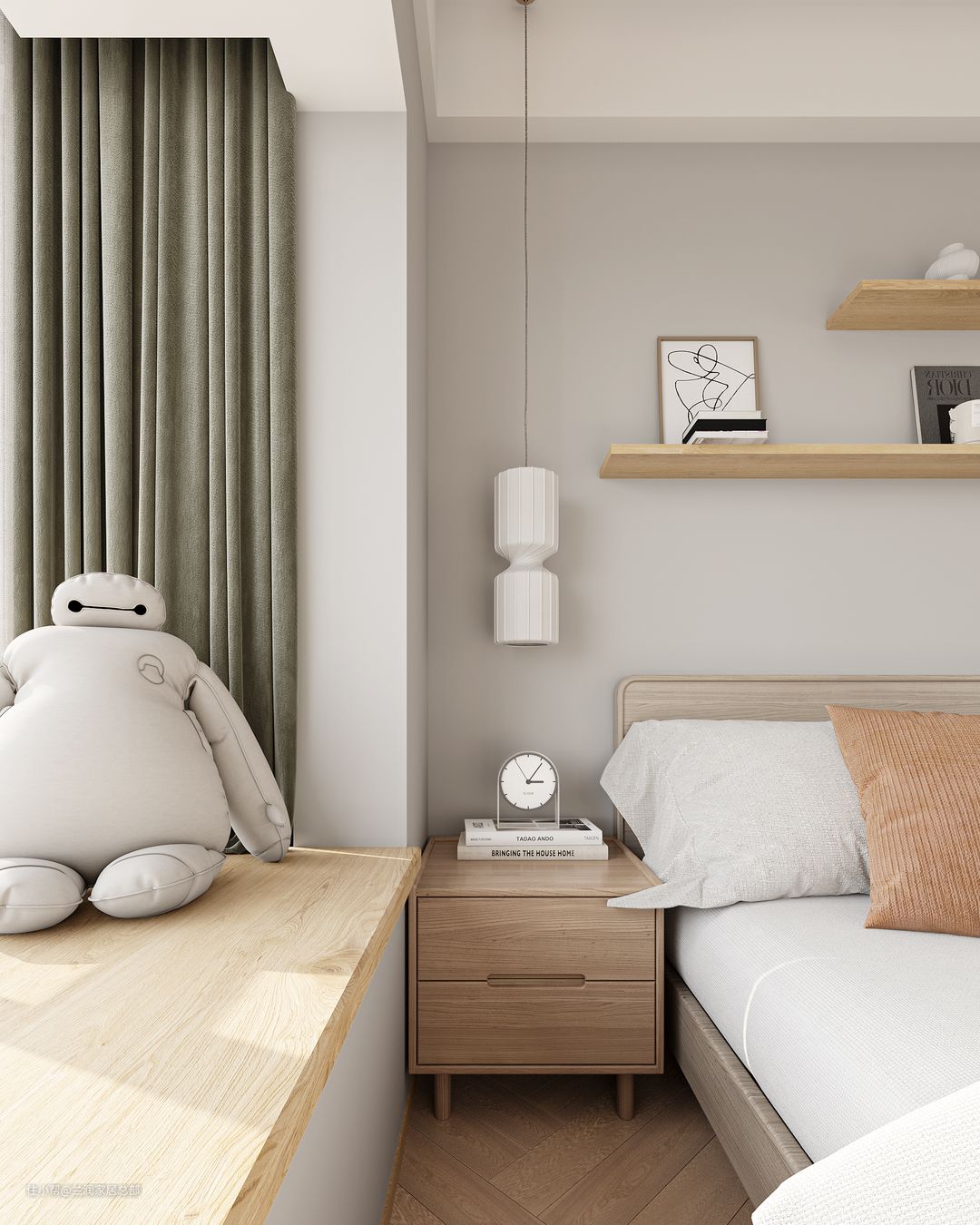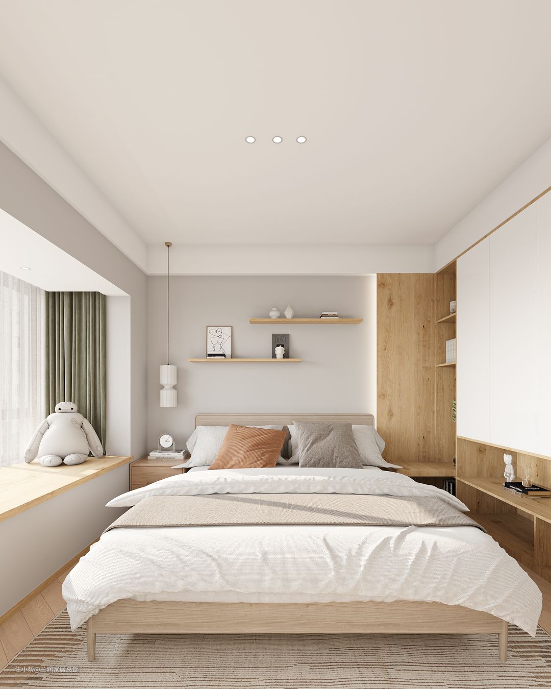 ❷让卧室保持舒适感还少不了“明亮”这一因素无主灯设计减少了照明死角让光线更均匀飘窗铺上原木板呼应卧室原木风主题墙面刷为浅灰色,卧室氛围更显柔和床头背景墙安装了两个原木置物板可用于摆放全家福、玩偶或艺术摆件增强了卧室的生活氛围,更显温馨.